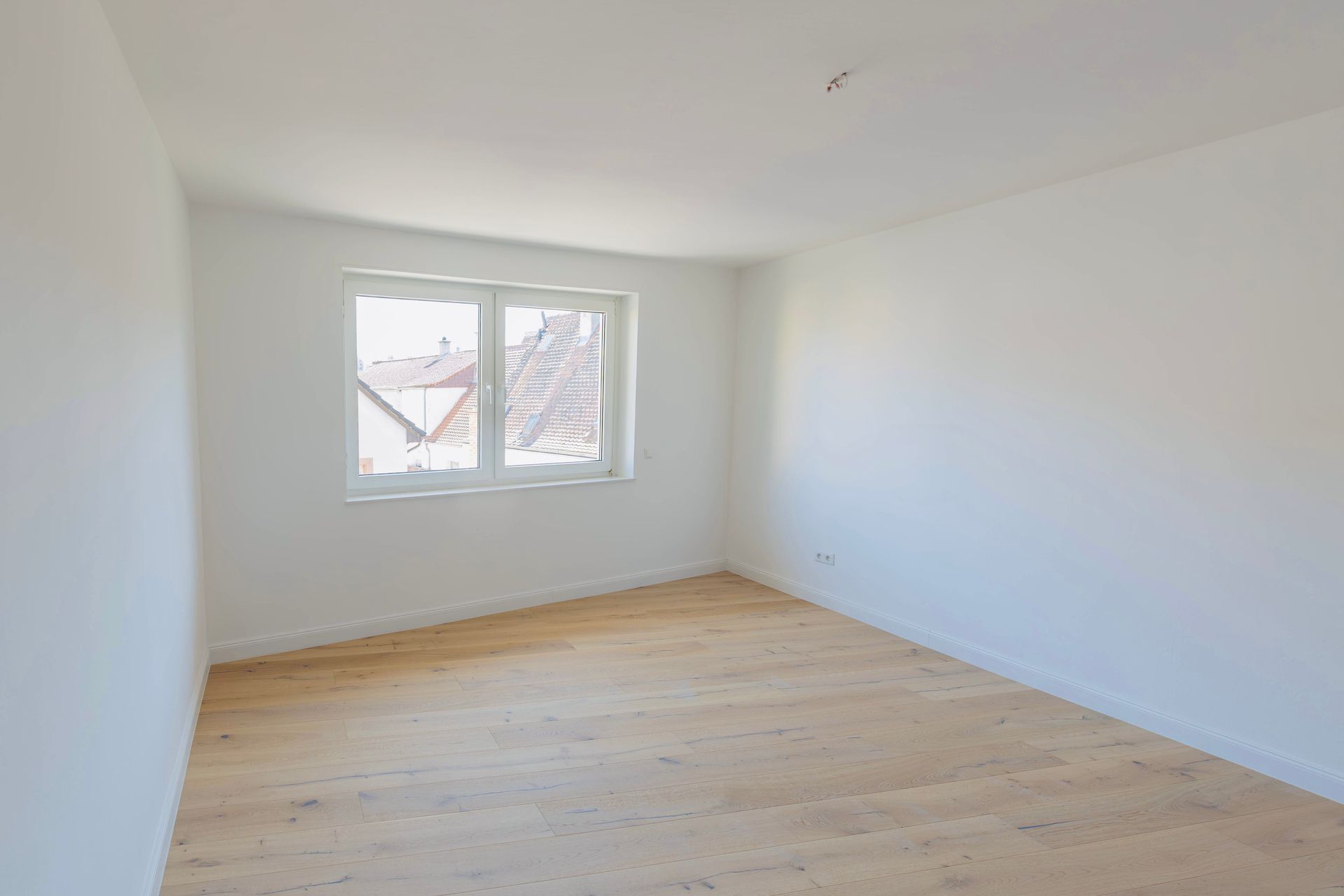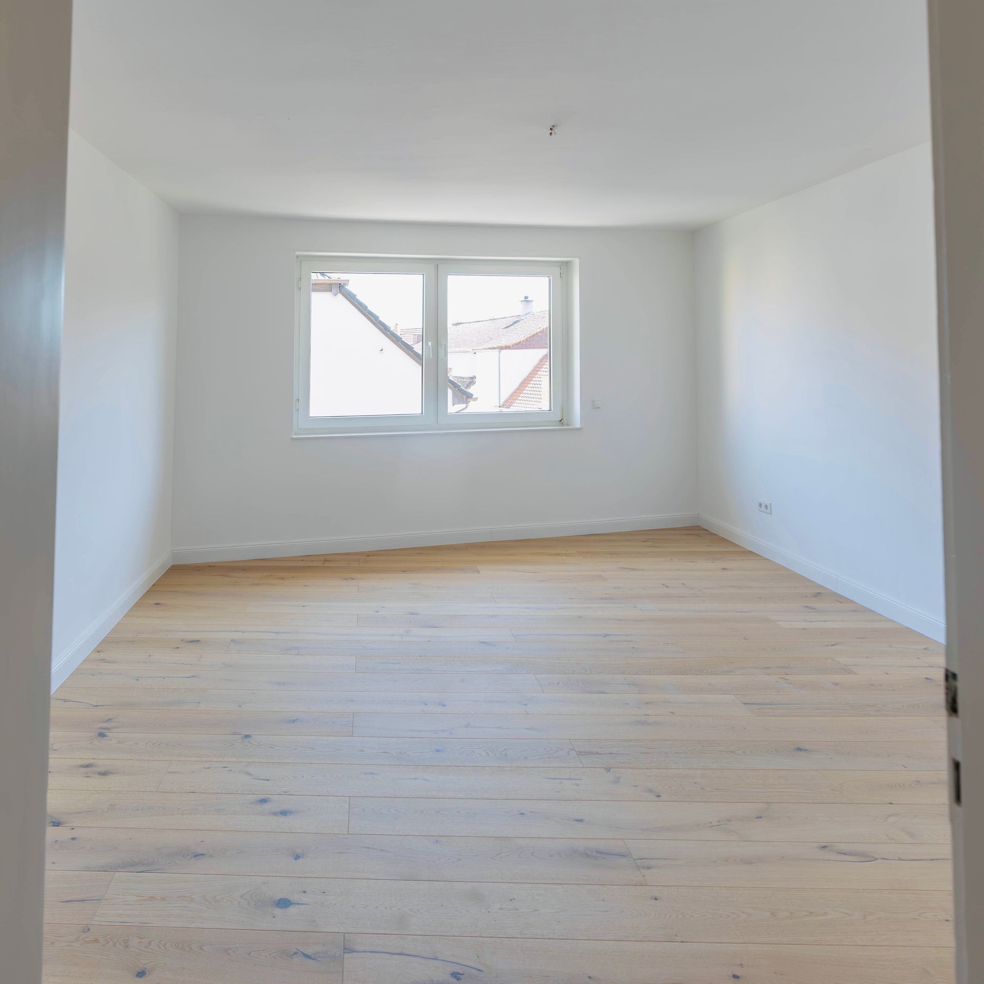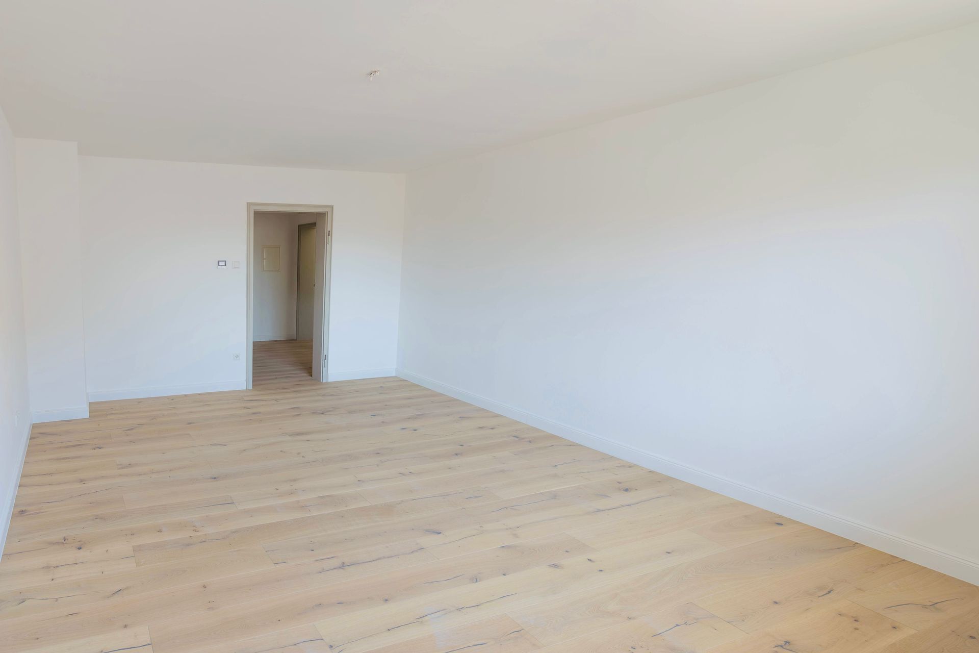 Das Elternschlafzimmer mit einer Fläche von knapp 20 m² bietet ausreichend Platz für ein großes Doppelbett, einen geräumigen Kleiderschrank sowie zusätzliche Kommoden. Auch die Integration eines Einbauschranks lässt sich hier problemlos realisieren. Direkt daneben befindet sich das etwas kleinere Kinder-, Gäste- oder Arbeitszimmer, das ebenfalls vielfältige Nutzungsmöglichkeiten eröffnet. In beiden Räumen – wie auch im Wohnzimmer und Flur – wurde ein hochwertiger Eichendielenboden verlegt, der gemeinsam mit den großen Fenstern eine warme Wohnatmosphäre schafft.