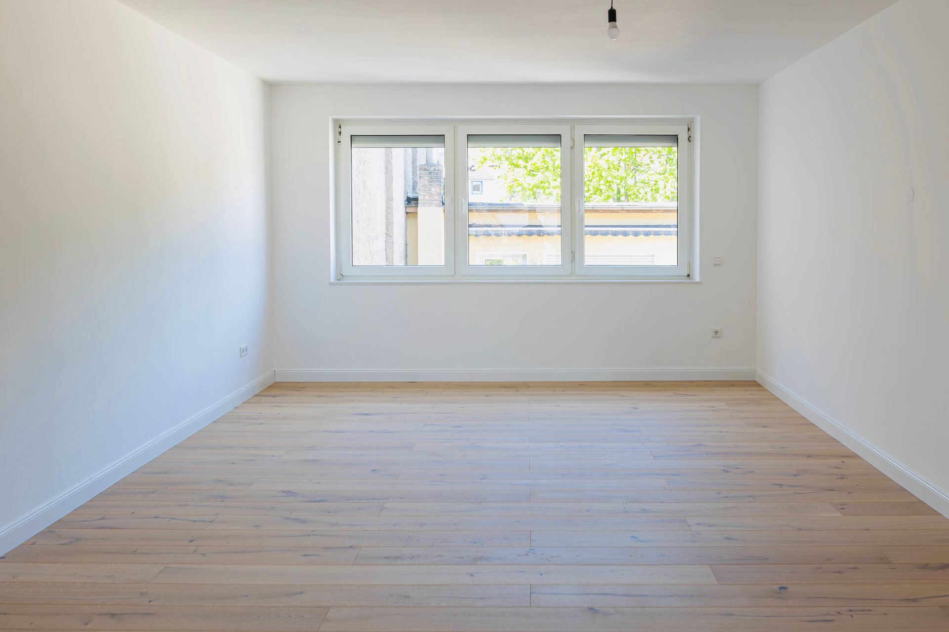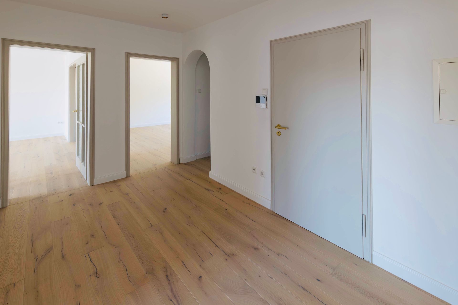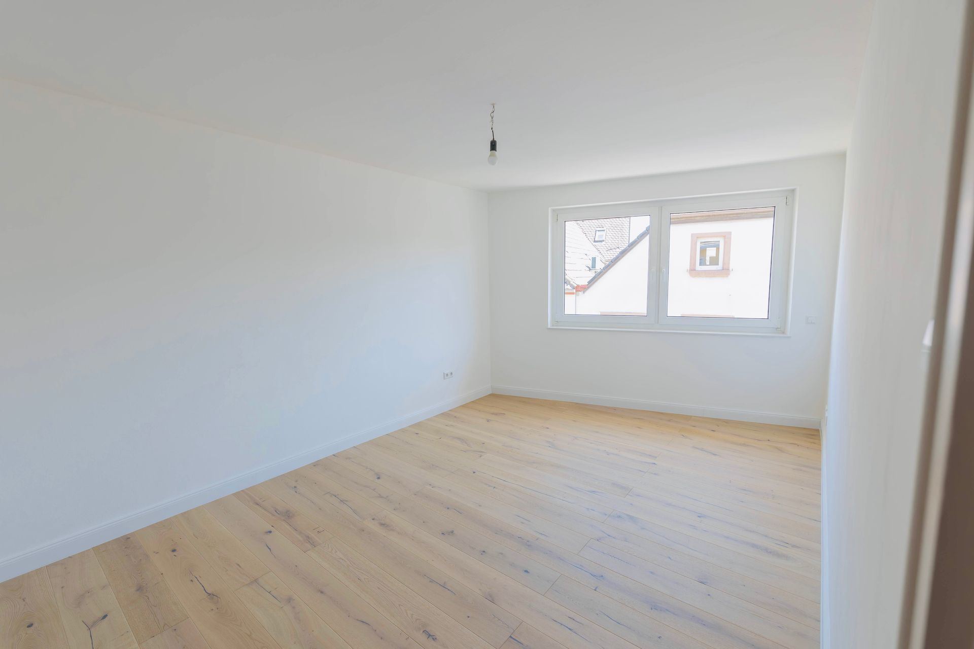 Das Elternschlafzimmer mit einer Fläche von knapp 20 m² bietet ausreichend Platz für ein großes Doppelbett, einen geräumigen Kleiderschrank sowie zusätzliche Kommoden. Auch die Integration eines Einbauschranks lässt sich hier problemlos realisieren. Direkt daneben befindet sich das etwas kleinere Kinder-, Gäste- oder Arbeitszimmer, das ebenfalls vielfältige Nutzungsmöglichkeiten eröffnet. In beiden Räumen – wie auch im Wohnzimmer und Flur – wurde ein hochwertiger Eichendielenboden verlegt, der gemeinsam mit den großen Fenstern eine warme Wohnatmosphäre schafft.