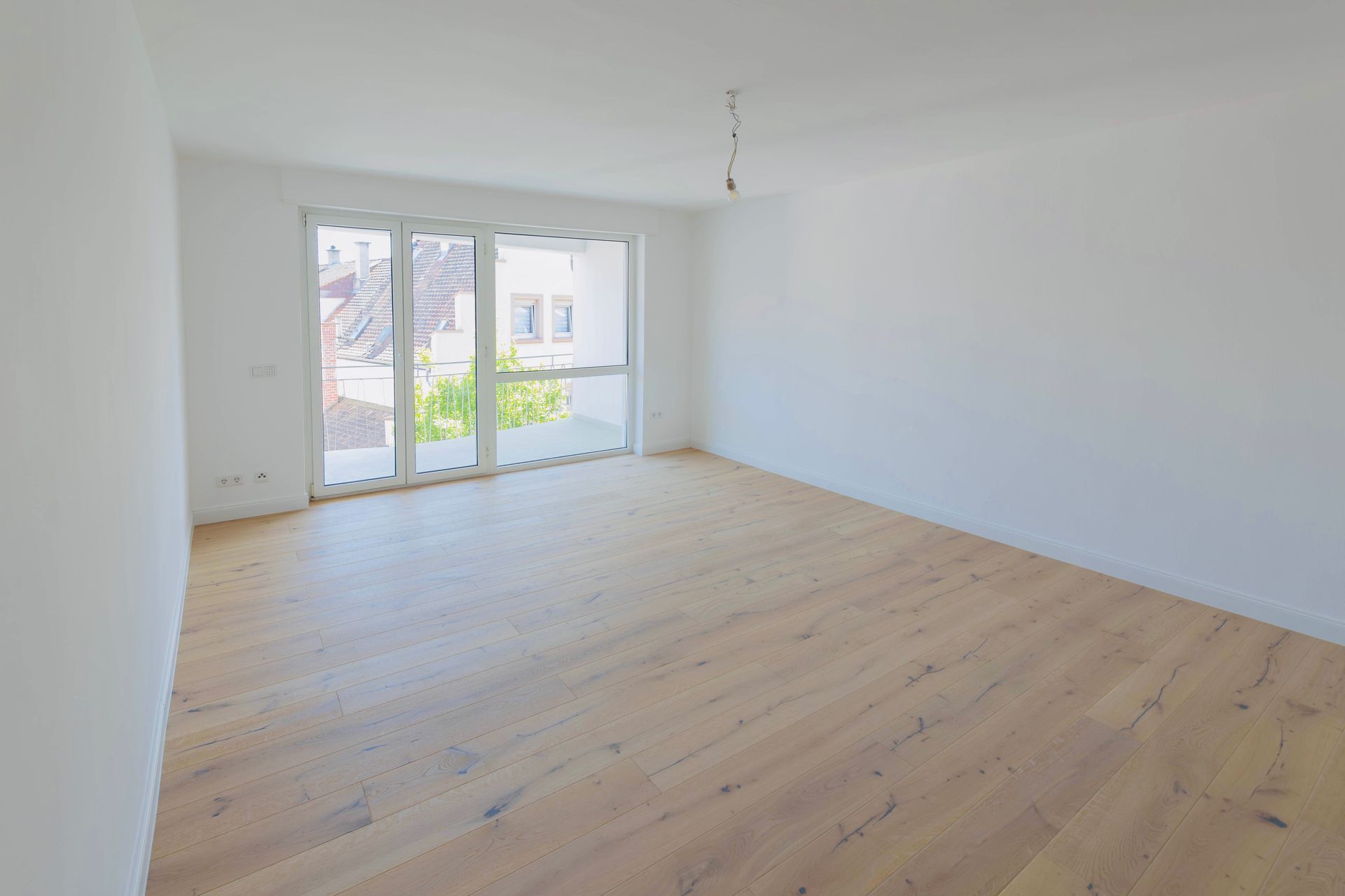 Durch die gegenüberliegenden Fenster fällt viel Tageslicht in den Raum, was die offene Gestaltung zusätzlich unterstreicht. Besonders schön: Der Wohnbereich öffnet sich zum großen Balkon mit geschwungener Brüstung – ein perfekter Ort für entspannte Momente an der frischen Luft.
