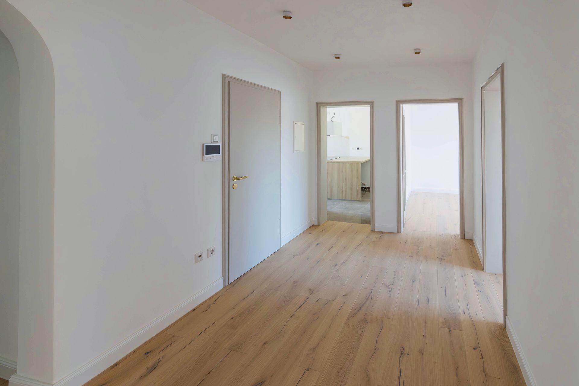 Das elegant gestaltete Tageslichtbad überzeugt mit einem zeitlosen Design. Mittelpunkt ist die begehbare Dusche mit moderner Regendusche und einem dahinterliegenden Fenster, das für angenehmes, natürliches Licht sorgt. Großformatige, helle Fliesen in Kombination mit goldenen Armaturen schaffen eine warme, stilvolle Atmosphäre. Ein Waschtisch aus Eichenholz ergänzt die hochwertige Ausstattung und bietet gemeinsam mit den darüber angebrachten Wandschränken ausreichend Stauraum.